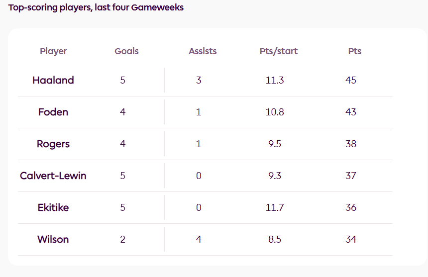 Haaland has the toughest fixture of the trio, visiting NFO. But with hauls of 14, 13 and 16 points over the last four Gameweeks, going against him is an increasingly risky tactic. Haaland and his team-mate Phil Foden (£9.0m) have been the top performers in Fantasy over the last four Gameweeks.