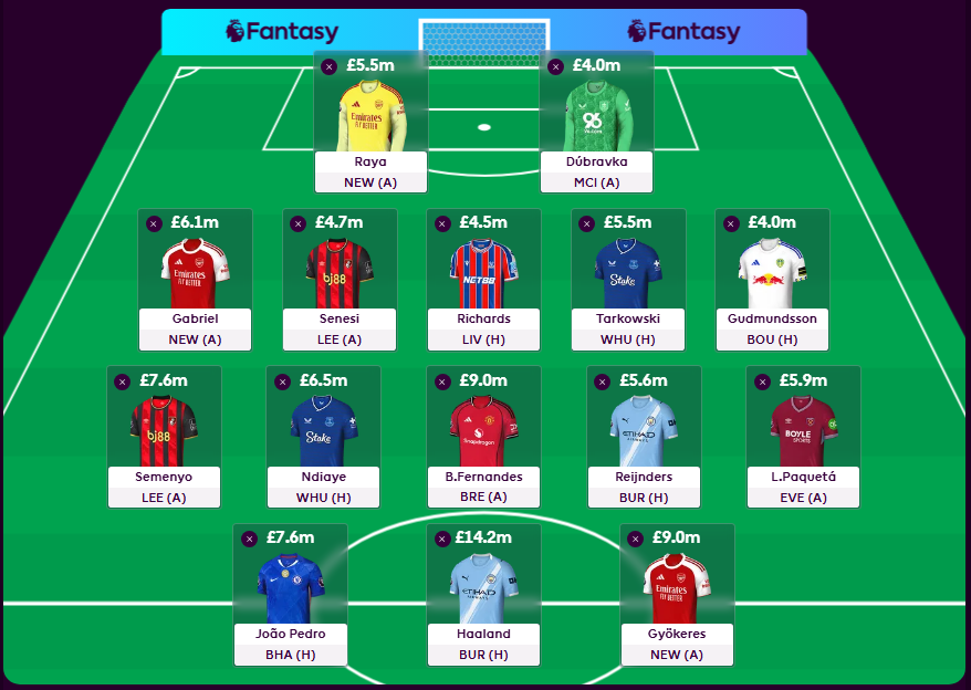 Playing the Wildcard allows you to remove underperforming players who are decreasing in value, such as Morgan Rogers (£6.9m), Florian Wirtz (£8.3m), Ollie Watkins (£8.8m); and buy players who are in-form and rising in value, like Marcos Senesi (£4.7m), Antoine Semenyo (£7.7m) and Erling Haaland (£14.3m).