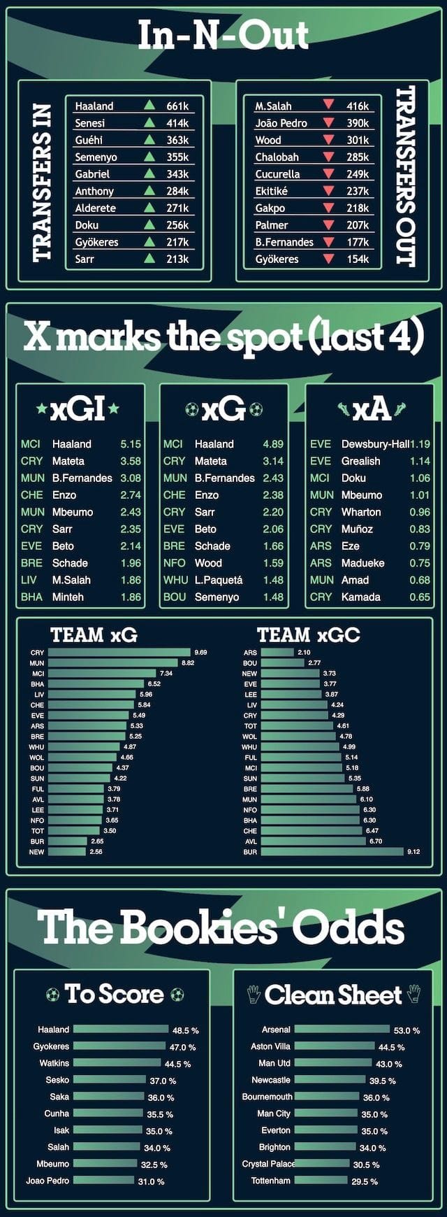 The minutes of their attackers are not as consistent as for their CB's. They are not such a lethal attack to justify spending much of your budget on 2 Arsenal attackers. Case in point - Gyokeres has scored in only 50% of the games he has played in this season.